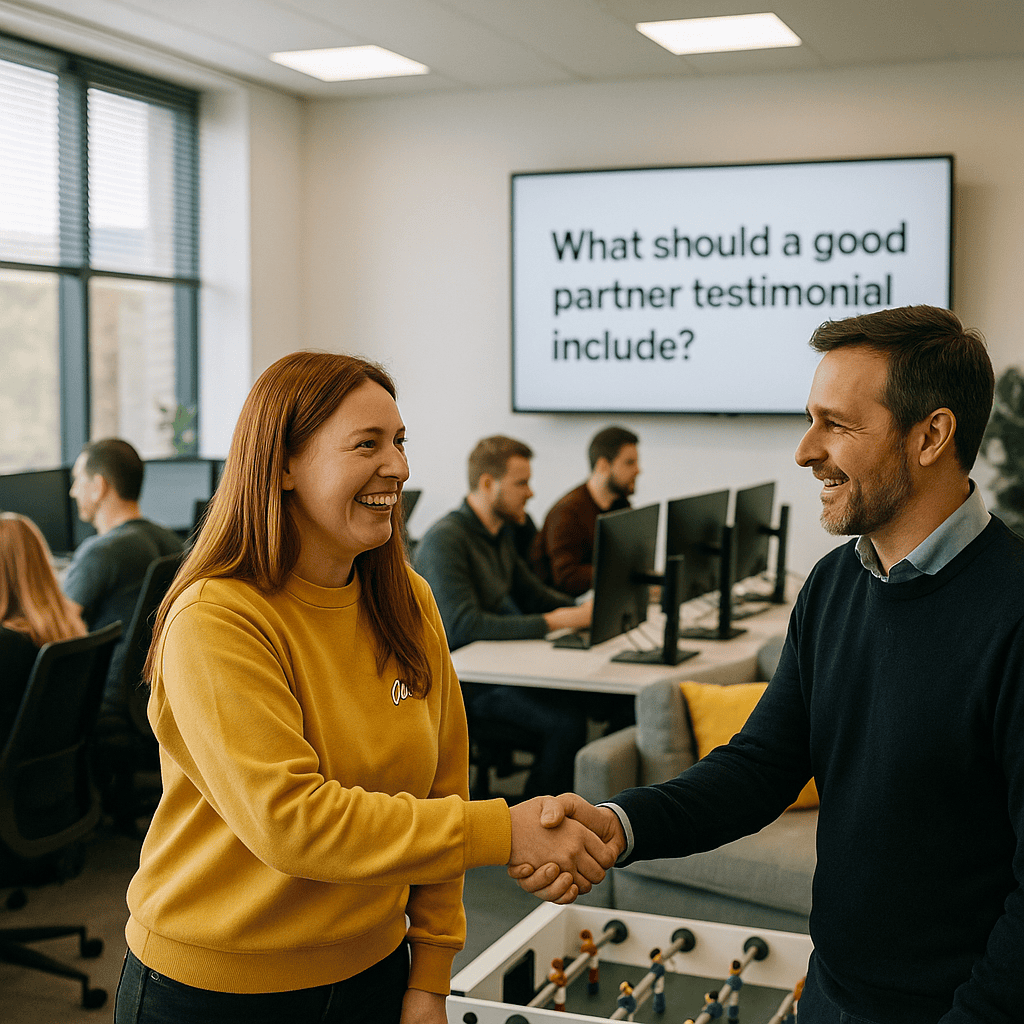 A good partner testimonial includes clear and specific details about the working relationship, emphasising measurable results or improvements. It should mention the partner’s industry or context to provide relevance and authenticity. Additionally, including the partner’s name, position, and company adds legitimacy and a personal touch to the endorsement.